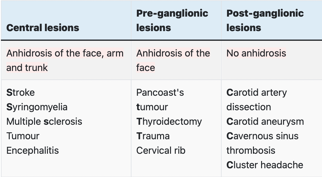 What are central lesions that can cause Horners syndrome