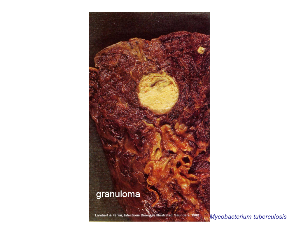 dying macrophages release toxic products -> necrosis of the center of the granuloma -> “caseating granuloma”