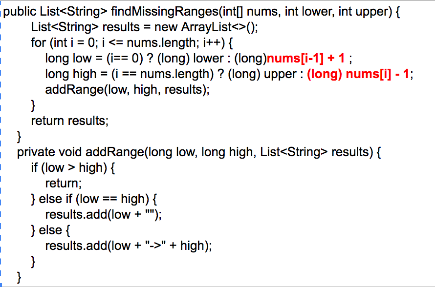 Given a sorted integer array where the range of elements are in the inclusive range [lower, upper], return its missing ranges
