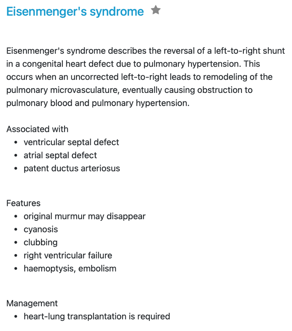 Eisenmenger’s syndrome is characterised by the reversal of the left-right shunt due to pulmonary hypertension.
