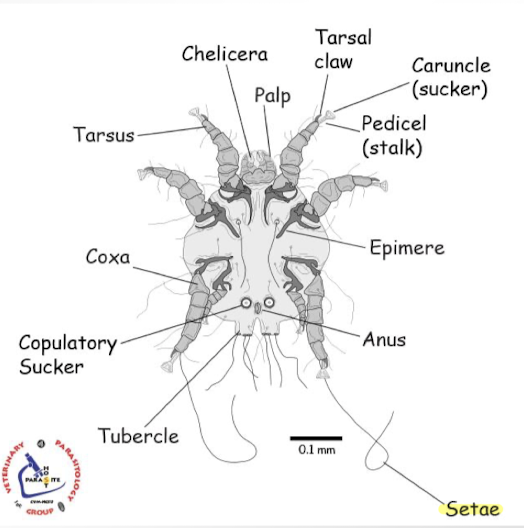 dermatitis, mite-induced allergic reactions, loss of blood or other body fluids, ositis externa and internal tissue damage, and transmission of pathogens