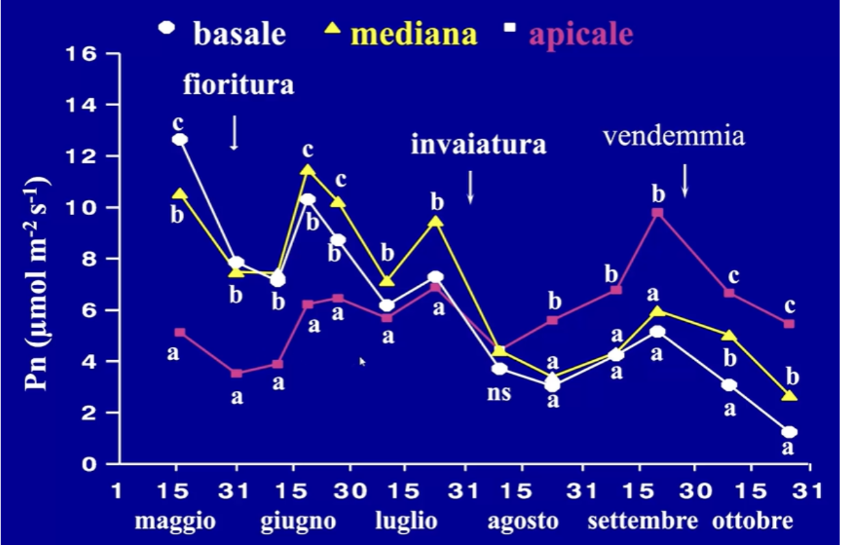 We can see that after veraison the apical part of the shoot is retaining the highest photosynthetic potential