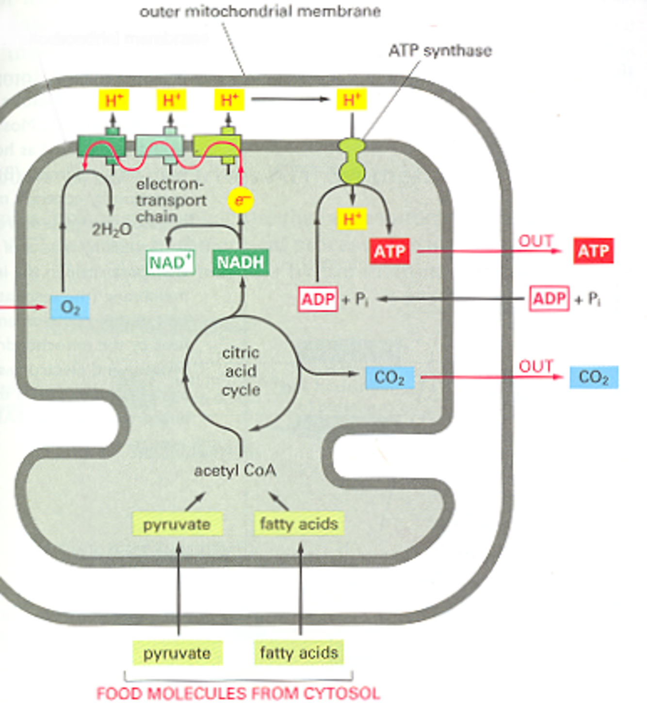 Oxygen in order to generate ATP. Pyruvate enters the mitochondrion in order to be fully oxidized by the Krebs cycle. The product of this process is energy in the form of ATP, by substrate level phosphorylation, NADH and FADH2.