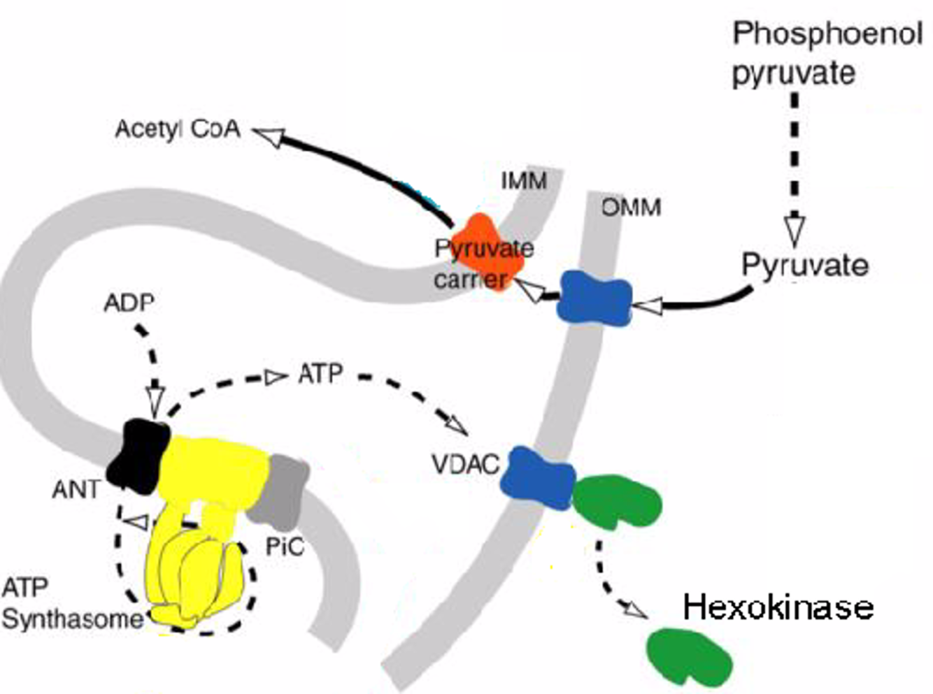 VDAC (voltage-dependent anion channel). Pyruvate (nutrients) also enter the cell using VDAC.