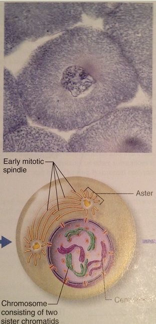 chromatin condenses, forming barlike chromosomes into sister chromatids held together by centromere, nucleoli disappear, and 2 centrosomes separate, the centrosomes act as focal points for growth of mitotic spindle which propel the centrosomes toward opposite ends[asters are seen from the matrix around centrosomes]