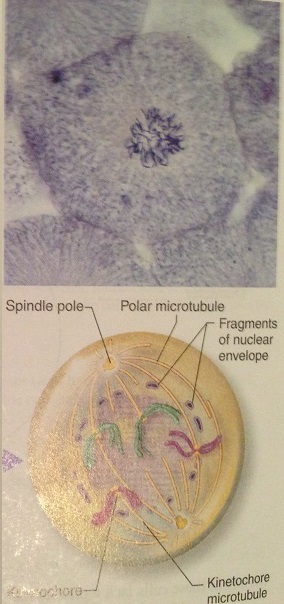 while centrosomes still move apart, nuclear envelope fragments allowing spindle to interact with the chromosomes, some attach to kinetochores, which pull on each chromo to the equator of the cell