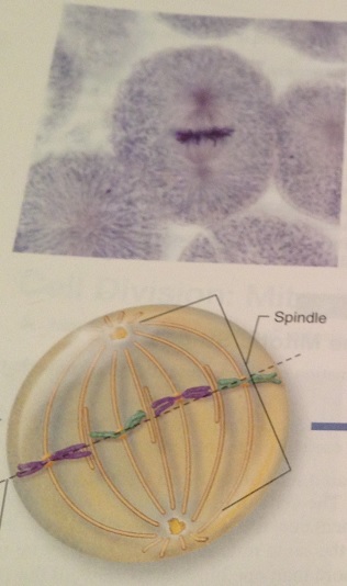second phase of mitosis where 2 centrosomes are at opposite poles, chromosomes cluster at middle with centromeres aligned at equator of spindle