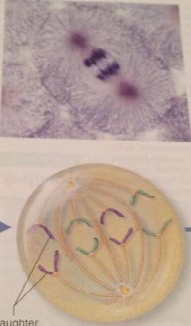 third and shortest phase of mitosis, each chromatid now becomes a chromosome. the kinetochore microtubules pull each choromo toward the pole it faces while the remaining spindle slide past each other, lengthenm,and push the 2 poles of the cell apart