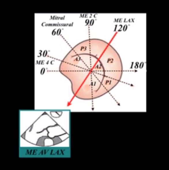 What view of the Mitral Valve is seen in the mid esophageal at approximately 120 degrees?