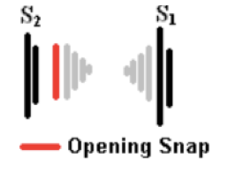 Auskultation med ett diastoliskt klickljud (opeining snap) klassiskt för mitralisstenos när främre klaffen snabbt pressas ner mot kammaren pga högt arteriellt fyllnadstryck).