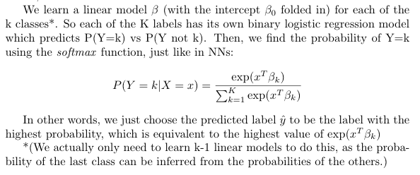 ML: How to we extend binary logistic regression to multinomial logistic regression? So our X’s are still n-dimensional vectors, but now our Y’s are scalars in [1,K]?