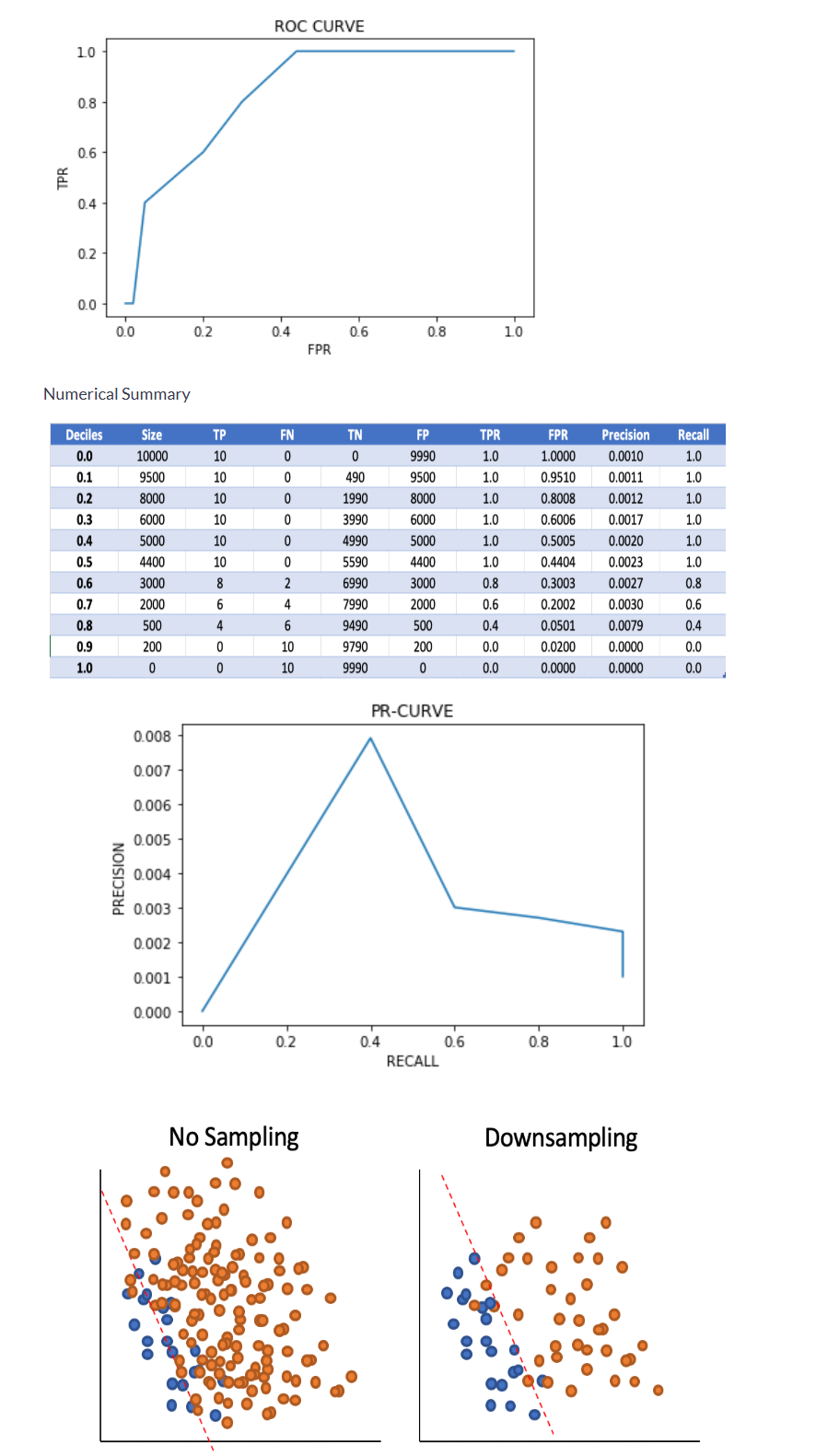 When you examine, decile threshold at lets say, 0.6, TPR is 0.8 and FPR is 0.3003. When you examine the model on this threshold, the model seems to do quite well given that 80% of the bads will be predicted accurately and about 30% of the negatives will be misclassified as good. However, this overlooks the volume of the total negatives misclassified in relation to the true positives. In other words, this metric is missing precision.