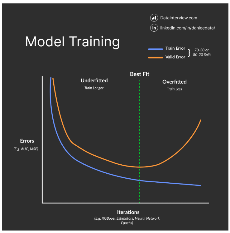 Bias: Bias is the difference between the average prediction of your model and the true value you are trying to predict. High bias means your model is overly simplistic. It has strong assumptions about the data which prevents it from learning the real underlying patterns. This leads to underfitting.