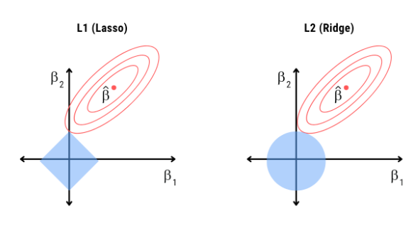 Observe the plot showing the L1 and L2 regularization constraint regions.