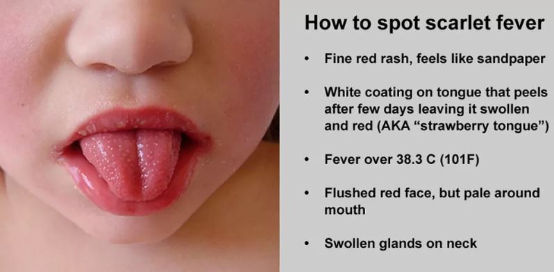 classically presents with a sore throat, fever, headache, bright red tongue and a coarse, red rash