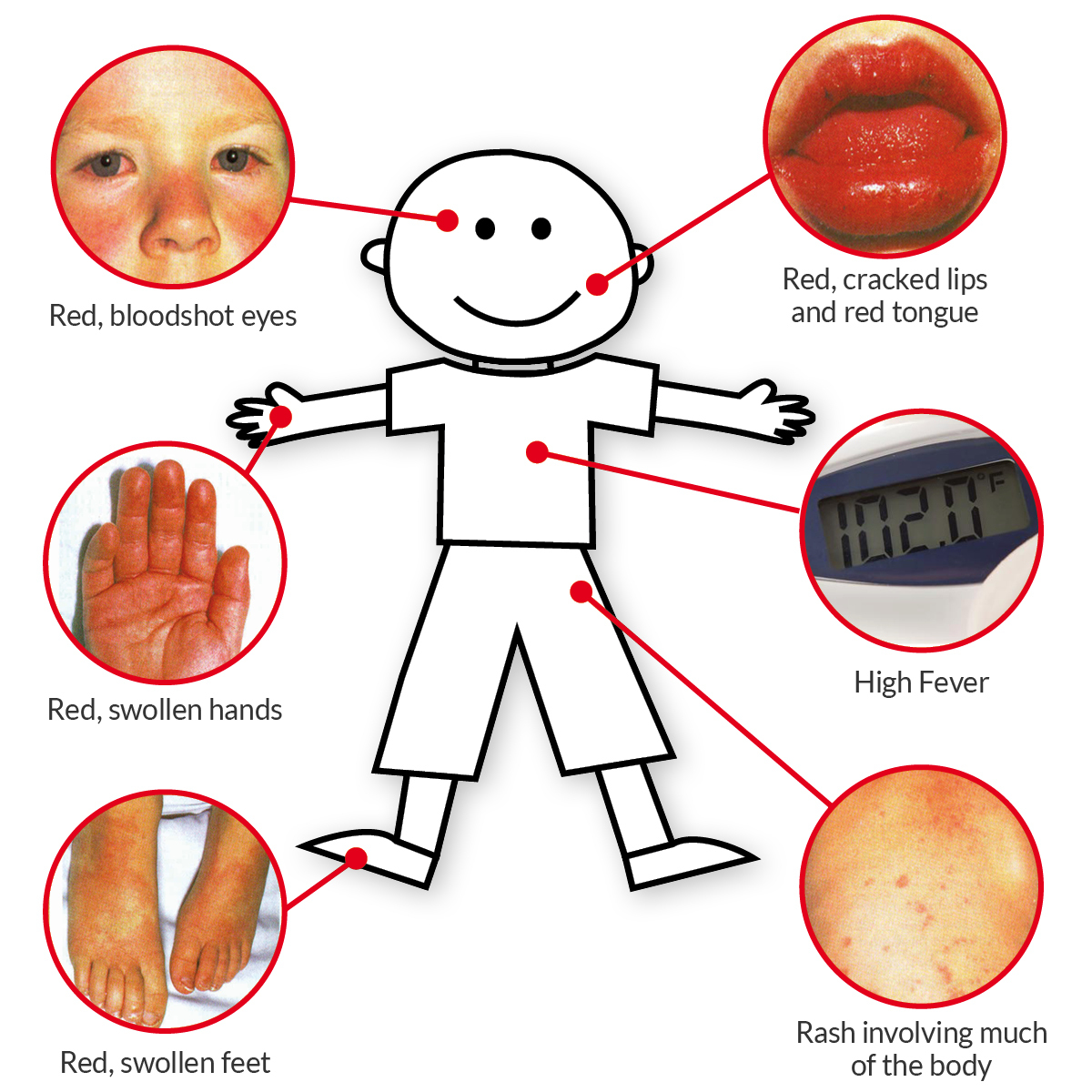 This condition presents with an erythematous polymorphous rash, strawberry tongue, cervical lymphadenopathy, bilateral conjunctivitis, oedema, erythema, and skin peeling of the hands and feet.