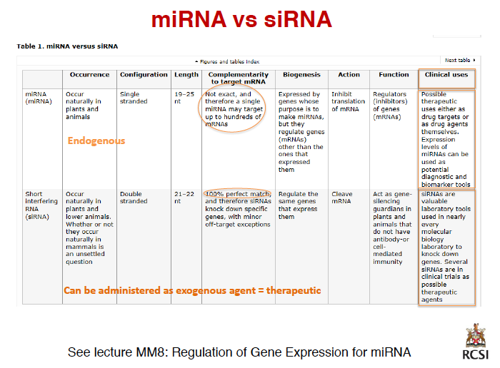 siRNA = originates from double stranded RNA - commonly responds to foreign RNA - it is always 100% complementary to the target mRNA and is specific for that message - we can introduce exogenously (as foreign object) to target specific points