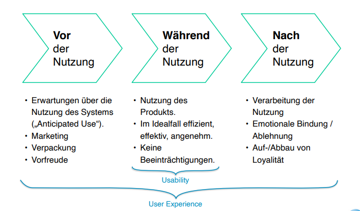 Nenn Bestandteile der einzelnen Phasen und ob es der Usability und/oder User Experience zugeordnet wird.
