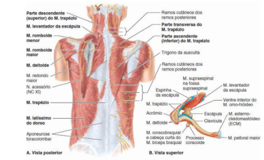 trapézio: fixa-se na protuberancia occipital eterna, ligamento nucal e processos espinhosos de C VII a TXII- clavicula, acromio e espinha da escápula-n acessório- parte desendente eleva, ascendente deprime e transversa retrai