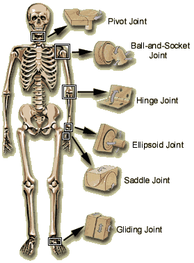 pivot, ball and socket, hinge, ellipsoid, saddle and gliding.