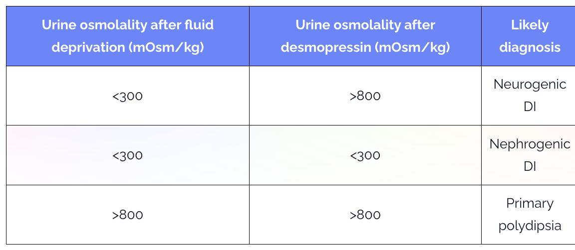 - If the diagnosis is nephrogenic DI then the urine osmolality will remain low throughout regardless of desmopressin. This is because the kidneys are unable to respond to either synthetic or endogenous ADH.