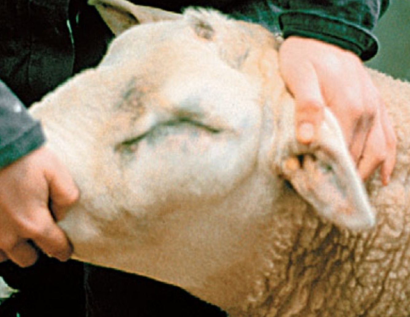 The most likely condition to consider based on the image and presentation is bighead (caused by Clostridium novyi, C. sordelli, or rarely C. chauvoei). Bluetongue is less likely based on one sheep being affected. Treatment with penicillin is usually effective.