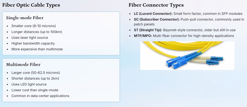 - Higher bandwidth, singlemode / multimode varieties