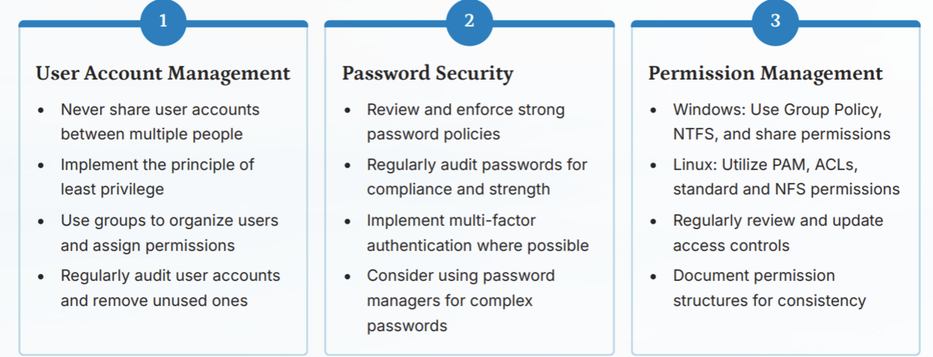 - Min 12+ characters, complex (upper/lowercase, numbers, symbols)