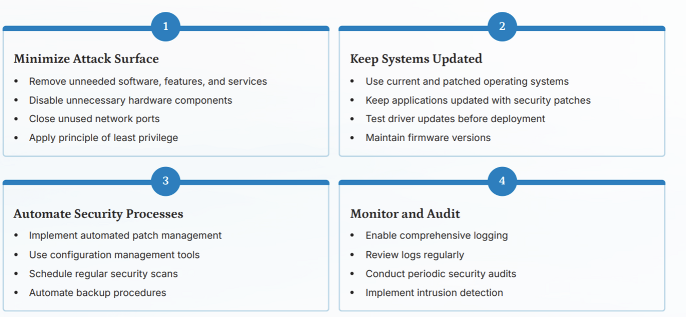 Minimize Attacks, Keep Systems Updated, Automate Security, Monitor/Audit