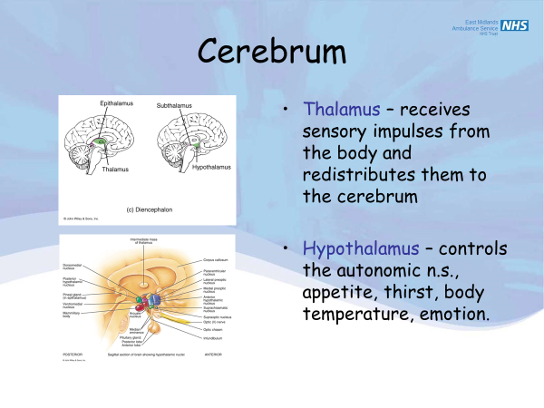 •Thalamus – receives sensory impulses from the body and redistributes them to the cerebrum