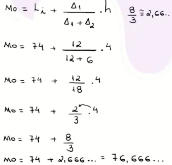 Como a moda bruta é 76 e a frequência posterior (13) é maior do que a anterior (7), a moda vai ser puxada pra cima, no caso 76,666…se a frequência anterior fosse maior, puxaria a moda para baixo, então a moda seria inferior a 76.