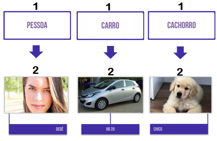 Nesse caso, Dedê é uma instância da entidade Pessoa, HB20 é uma instância da entidade Carro e Chico é uma instância da entidade Cachorro.