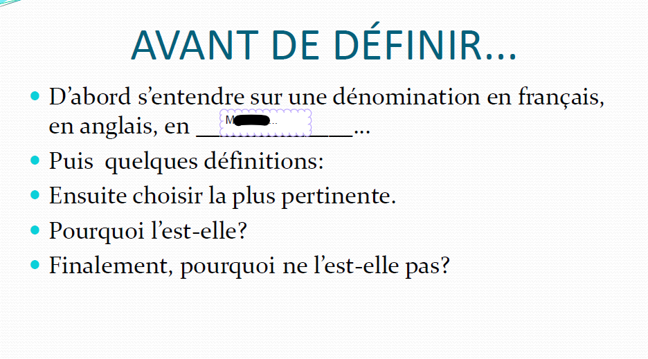 Lors du processus de définition, le terme ou le nom doit être défini le plus précisément possible La définition devrait circonscrire les fr______ d un terme de manière à distinguer ce qui est i_____ de ce qui ne l est p___