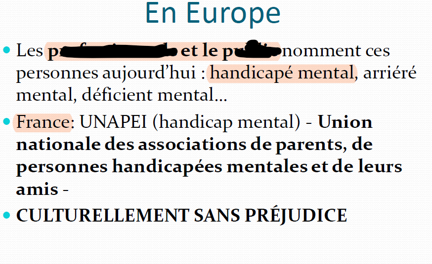 handicapped , mental deficiency ou encore persons with specials needs qui englobe plusieurs catégories de personnes.