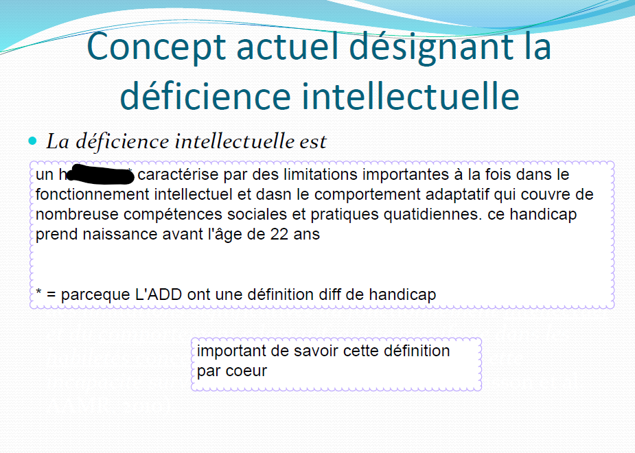 un handicap* caractérise par des lI______ importantes à la fois dans le fo_______in______ et dasn le comportement ad_____qui couvre de nombreuse compétences so____ et pr_____ quatidiennes. ce handicap prend naissance avant l’âge de __ ans