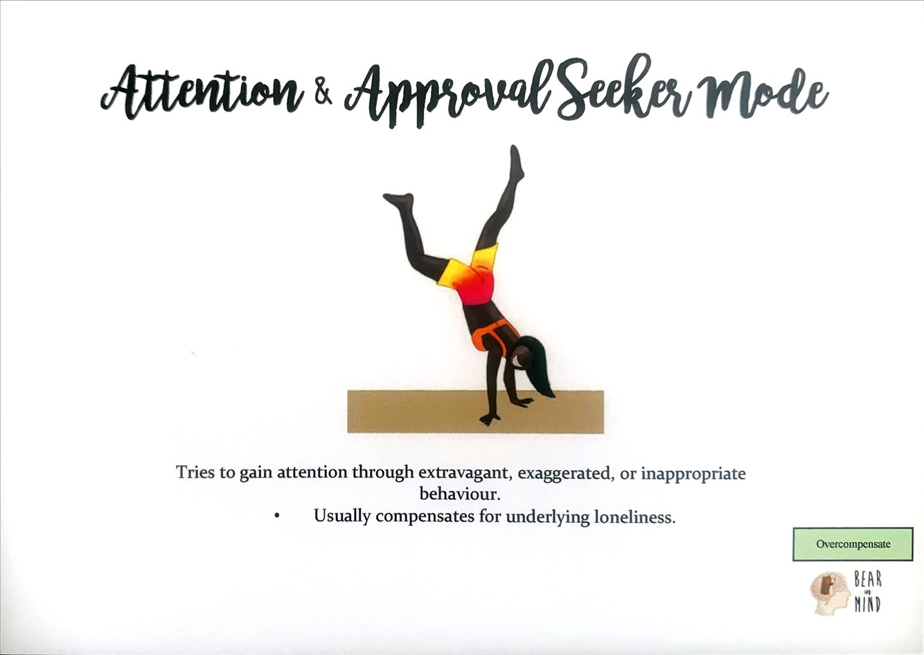 * seeks attention passively, e.g. by exaggerated withdrawal, submissiveness, hopelessness, self-denial, or complaint