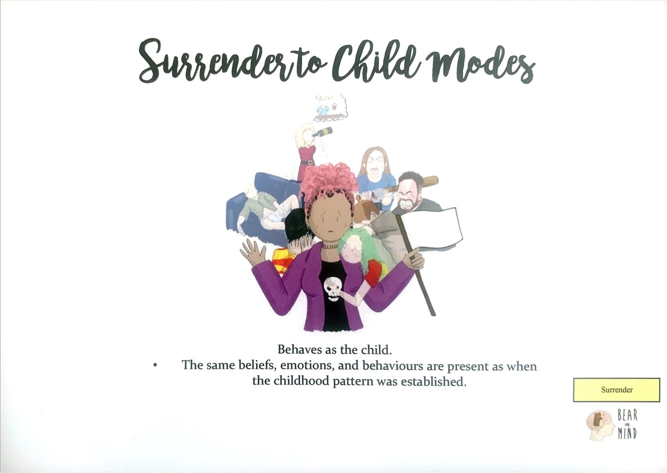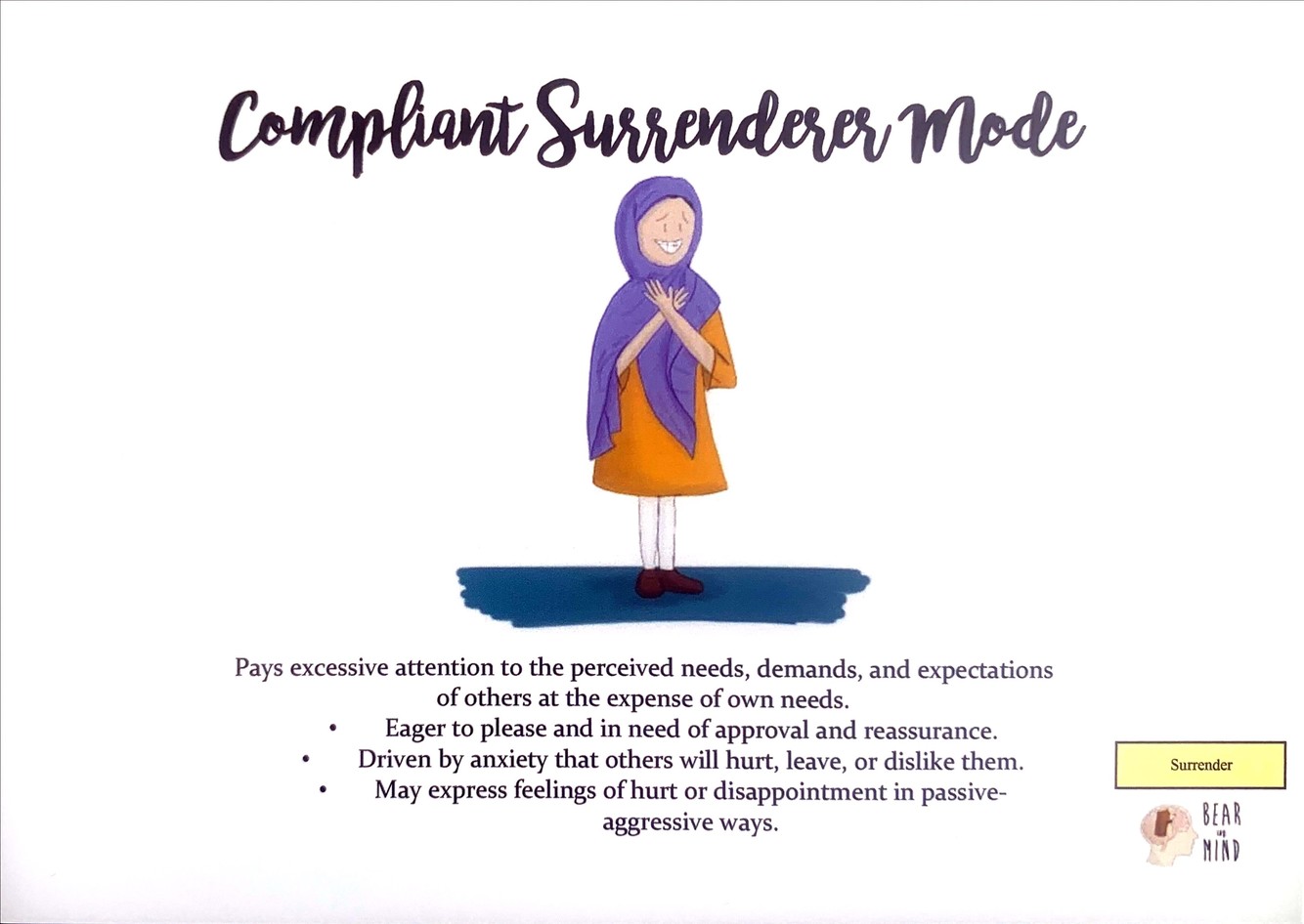 * surrenders to maladaptive schemas but does not allow the Vulnerable Child to access care, pushing others away with complaints that they do not and cannot understand