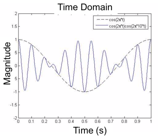 To vary the amplitude with the input signal the whole thing is multiplied by the original signal ( cos(2πt) ). [IMAGE 15]