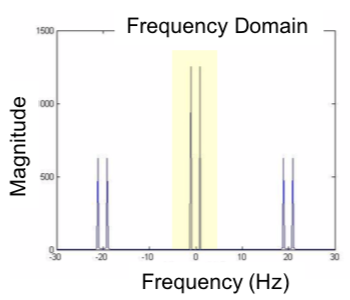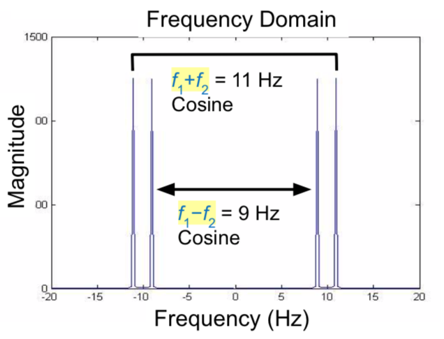 The incoming signal is multiplied by the carrier signal. This results in the original signal and higher frequency sinusoids. [IMAGE 17]