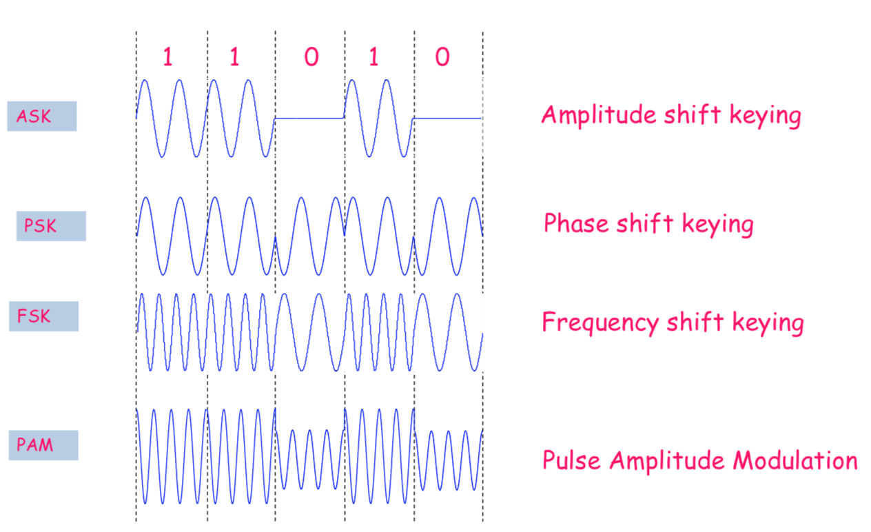ASK = Amplitude shift keying PSK = Phase shift keying FSK = Frequency shift keying PAM = Pulse amplitude modulation [IMAGE 18]
