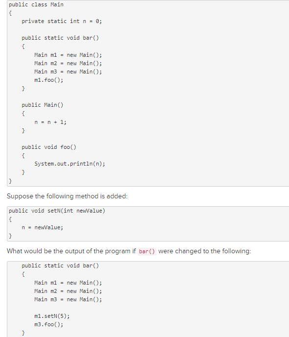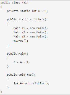 The instance variable n Is declared static, so it is shared by all instances of class Main. Since n is incremented by each constructor, the value of n after three instantiations is 3. It does not matter on which instance foo() is called.