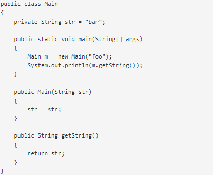 In Main(String str), the parameter name string shadows the instance variable name string. The statement string = string assigns the parameter string to itself, and so the assignment has no effect outside of Main(String str). Therefore, getString() will return the static variable bar.