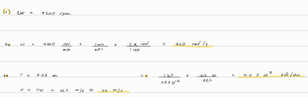 5. (II) The platter of the hard drive of a computer rotates at 7200 rpm (rpm = revolutions per minute = rev/min). (a) What is the angular velocity (rad/s) of the platter? (b) If the reading head of the drive is located 3.00 cm from the rotation axis, what is the linear speed of the point on the platter just below it? (c) If a single bit requires 0.50 m of length along the direction of motion, how many bits per second can the writing head write when it is 3.00 cm from the axis?