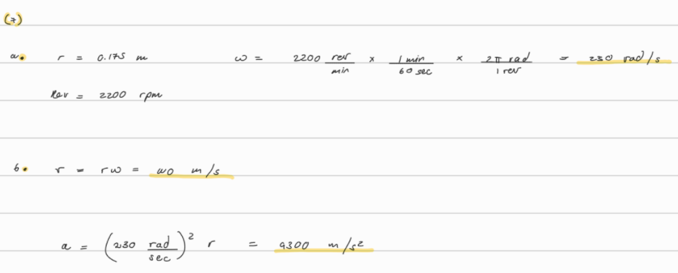 7. (II) (a) A grinding wheel 0.35 m in diameter rotates at 2200 rpm. Calculate its angular velocity in rad/s. (b) What are the linear speed and acceleration of a point on the edge of the grinding wheel?