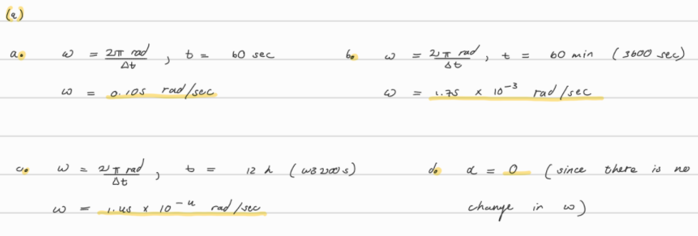 9. (II) Calculate the angular velocity (a) of a clock’s second hand, (b) its minute hand, and (c) its hour hand. State in rad/s. (d) What is the angular acceleration in each case?