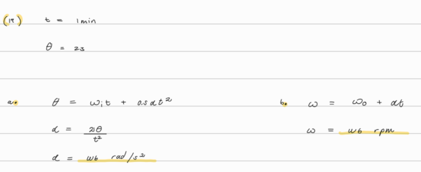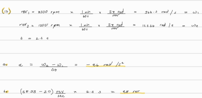 17. (I) An automobile engine slows down from 3500 rpm to 1200 rpm in 2.5 s. Calculate (a) its angular acceleration, assumed constant, and (b) the total number of revolutions the engine makes in this time.
