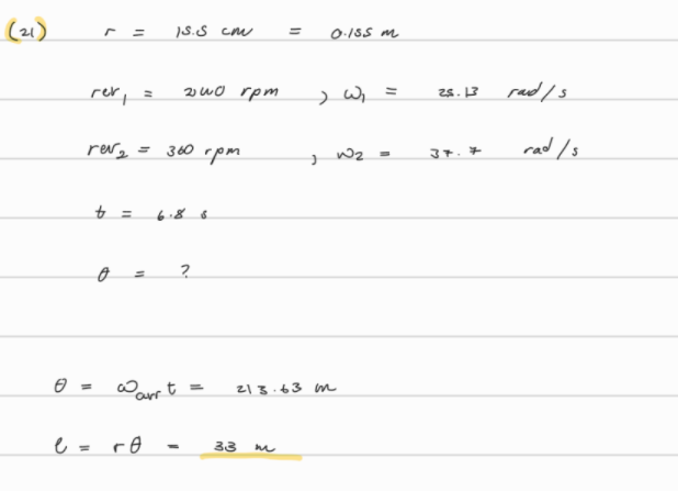 21. (II) A wheel 31 cm in diameter accelerates uniformly from 240 rpm to 360 rpm in 6.8 s. How far will a point on the edge of the wheel have traveled in this time?