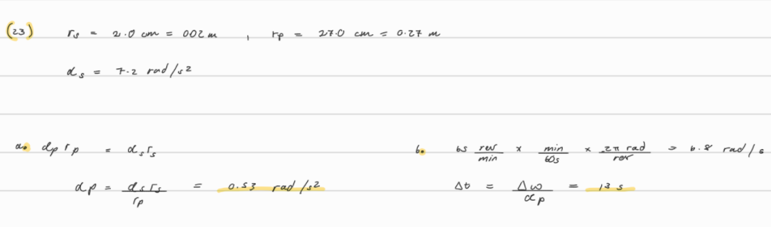 23. (II) A small rubber wheel is used to drive a large pottery wheel. The two wheels are mounted so that their circular edges touch. The small wheel has a radius of 2.0 cm and accelerates at the rate of 7.2 rad/s2, and it is in contact with the pottery wheel (radius 27.0 cm) without slipping. Calculate (a) the angular acceleration of the pottery wheel, and (b) the time it takes the pottery wheel to reach its required speed of 65 rpm.