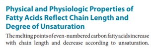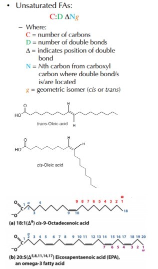 Carbon atoms are counted from the carboxyl carbon (C-1). Succeeding carbons C-2, C-3, and C-4 are also known as ⍺, 𝛽, and 𝛾 carbons. DΔN denotes the number of double bonds (D) and position (N) from the carboxyl carbon (C-1). Trans isomers have hydrogen on opposite side; cis isomers have hydrogen bonds on the same side. Structure shows an 18-carbon fatty acid with 3 double bonds located at the 9th, 12th, and 15th carbon from C-1 all in the cis formation (18:3Δ9,12,15)-all cis. Reference: Dr. Van Haute - Lecture on Carbohydrates and Lipids of Physiologic Significance (Part 3)