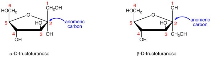 Anomers are isomers that differ at a new asymmetric carbon atom formed on ring closure. Furanose-ring of fructose has anomeric forms ⍺ and 𝛽 at the anomeric carbon C2 (see image below). These two structures are present at equilibrium. (Tymoczko, Berg, and Stryer, 2015, pg. 170) Reference: Tymoczko, J. L., Berg, J. M., & Stryer, L. (2015). Biochemistry: A short course (p. 170). New York: W.H. Freeman & Company.